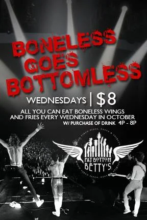 We will be rubbing elbows, taking pictures, and signing autographs with our fans at Fat Bottom Betty's on Wed Oct 8th from 4pm-8pm. As if SIRG being there wasn't good enough it will be "Boneless Goes Bottomless" night so make sure to get your fill of wings. It will be all you can eat boneless wings and fries for $8 with the purchase of a drink.